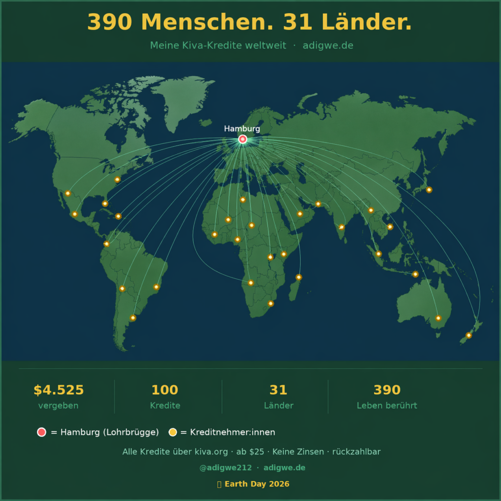 Seit einigen Jahren verleihe ich Geld über kiva.org. Nicht viel – meistens 25 Dollar pro Kredit. Aber inzwischen sind es 100 Kredite, 4.525 Dollar insgesamt, 31 Länder und 390 Menschen die ich damit ein Stück weit unterstützt habe.